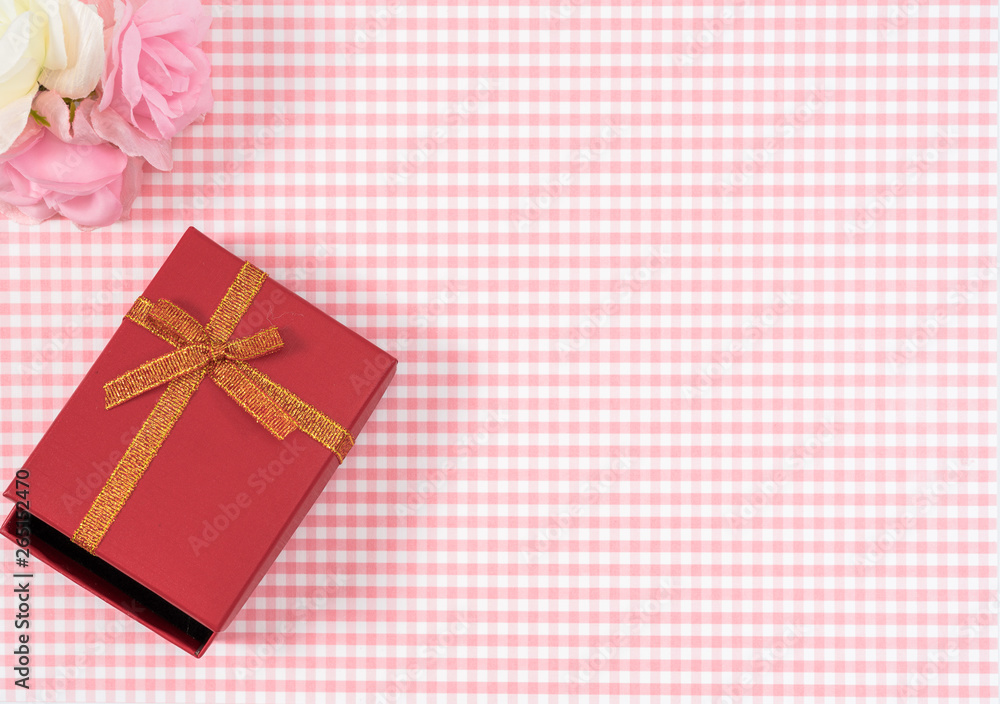 gift box with red isolated on Plaid background. Holiday decoration for Mother's Day or Women's Day.
