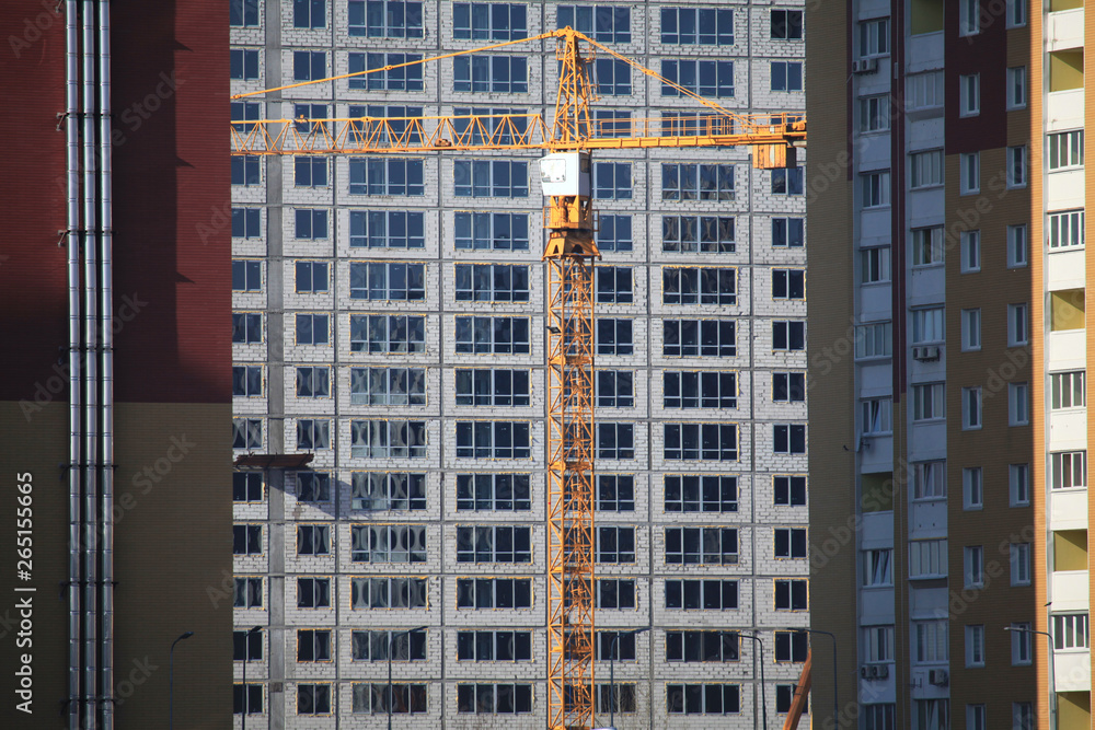 Kiev, Ukraine – February 17, 2019: Construction crane between multi-storey apartment buildings. A new housing estate. Unfinished building сonstruction. Construction site