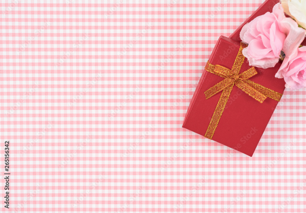 gift box with red isolated on Plaid background. Holiday decoration for Mother's Day or Women's Day.