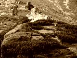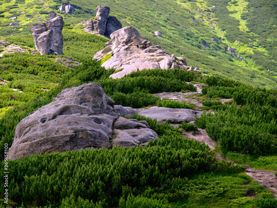 The stone figures and silhouettes in Eastern Carpathian montains, Ukraine. Colorful landscape of mountains, stones and high mountain vegetation