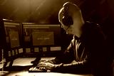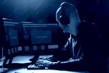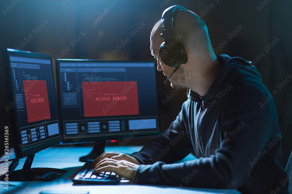 cybercrime, hacking and technology concept - male hacker in headset with access denied messages on computer's screens wiretapping or using computer virus program for cyber attack in dark room