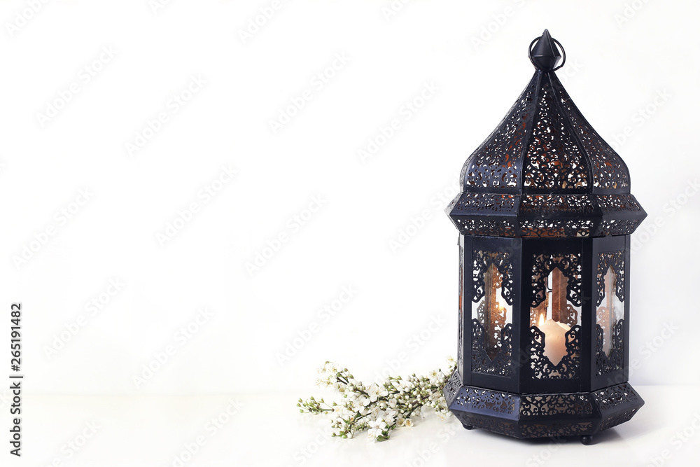 Ornamental black Moroccan, Arabic lantern with blooming prunus tree branches on white table. Greeting card for Muslim community holy month Ramadan Kareem. Festive background.