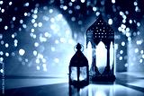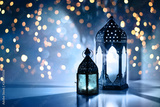 Couple of glowing Moroccan ornamental lanterns on the table. Greeting card, invitation for Muslim holy month Ramadan Kareem. Festive blue night background with glittering golden bokeh lights.