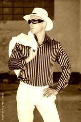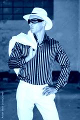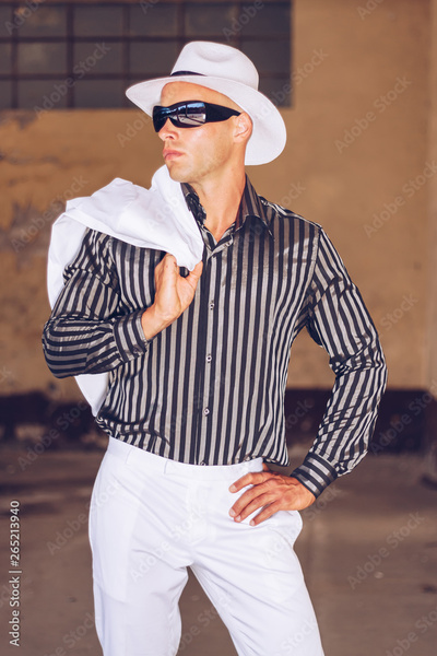 Fancy fashionable man with black sunglasses , white hat and white summer suit posing.