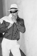 Fancy fashionable man with black sunglasses , white hat and white summer suit posing.