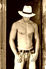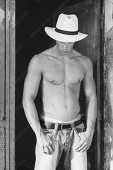 Beautiful male with blue eyes and sexy muscular body wear denim jeans and white hat with naked torso. Fitness male with healthy tan posing.