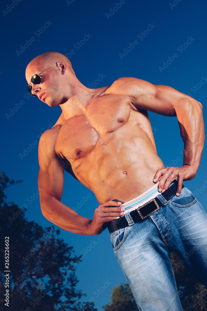 Strong male with blue eyes and sexy muscular body wear denim jeans and gold sunglasses with naked torso. Fitness male with healthy tan posing.