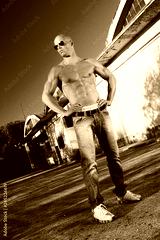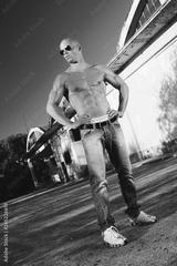 Strong male with blue eyes and sexy muscular body wear denim jeans and gold sunglasses with naked torso. Fitness male with healthy tan posing.