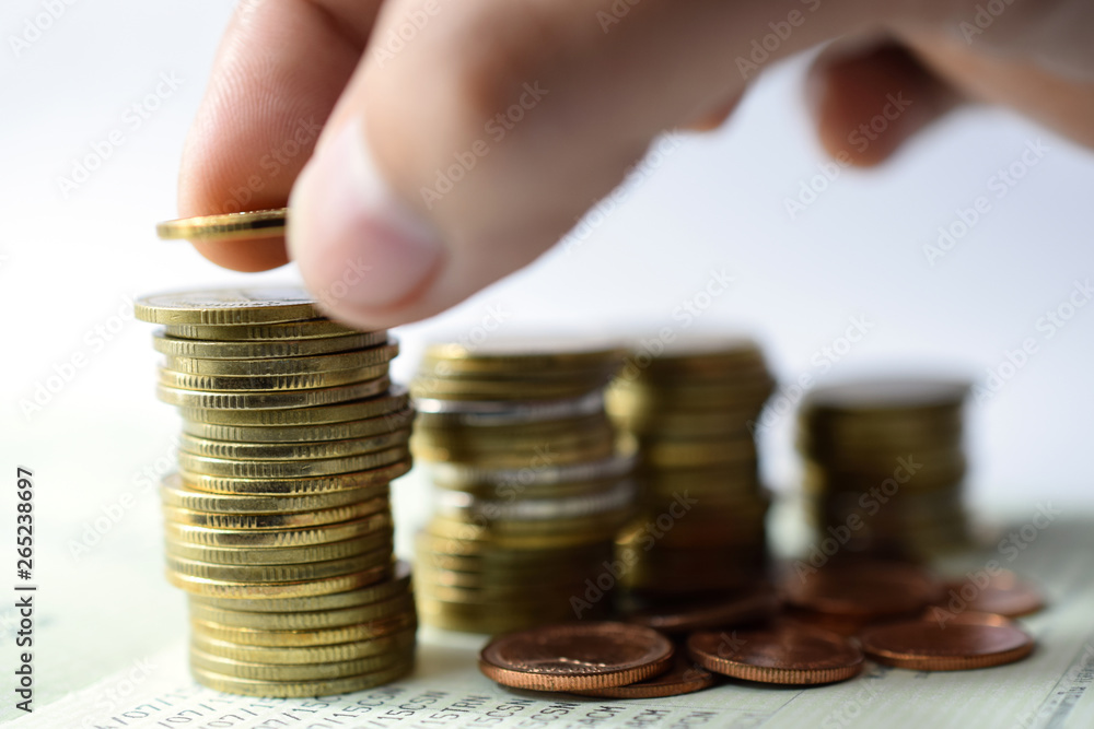 Saving money concept preset by hand putting money coin stack growing business