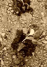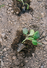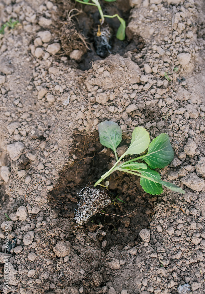 Young cabbage seedlings on a ground. Top view