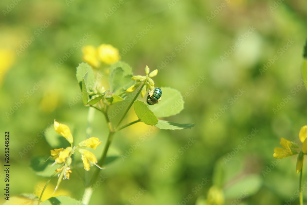 Cuckoo wasp or emerald wasp on Yellow Fenugreek (Trigonella foenum-graecum) Flowers.