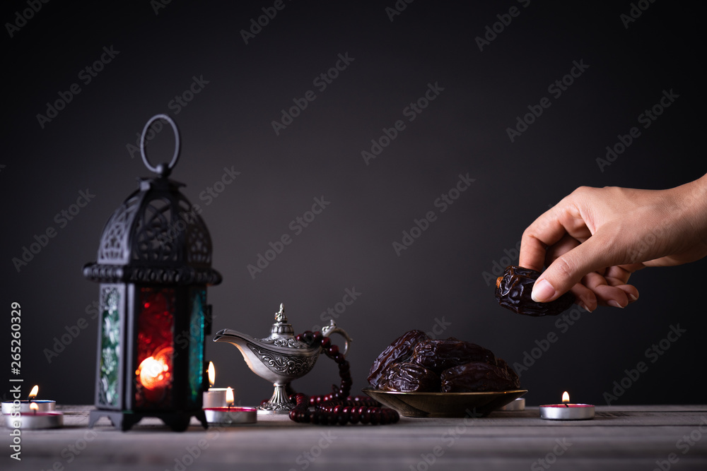 Ramadan food and drinks concept. Woman hand reaches out to a plate with date with Ramadan Lantern with arabian lamp, wood rosary, tea, dates fruit and lighting on a wooden table on dark background.
