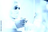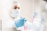 Serious concentrated young Arabian medical scientist in protective workwear and mask comparing liquids in test tubes while working with hazardous substances in laboratory