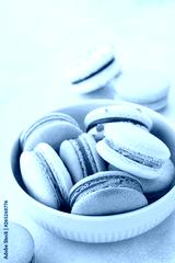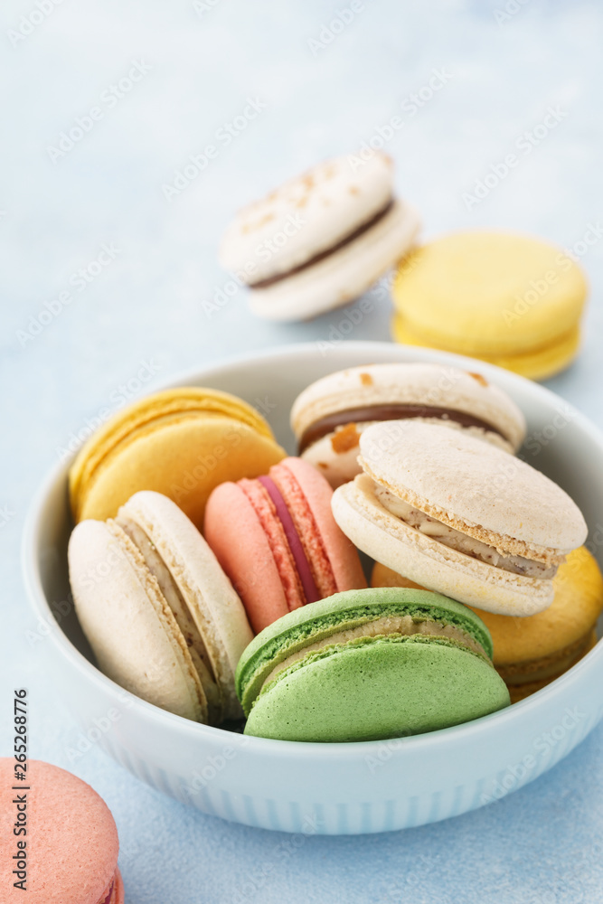 Colorful french macarons in a bowl on blue background.