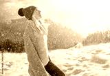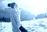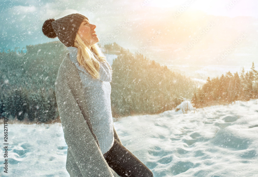 Portrait Happy woman traveler on the snowy of mountain look on t