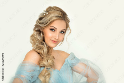 portrait of a beautiful young girl with a gentle make-up and hairstyle on a white background