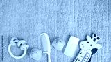 Baby accessories for bathing and toy on towel with copy space, flat lay