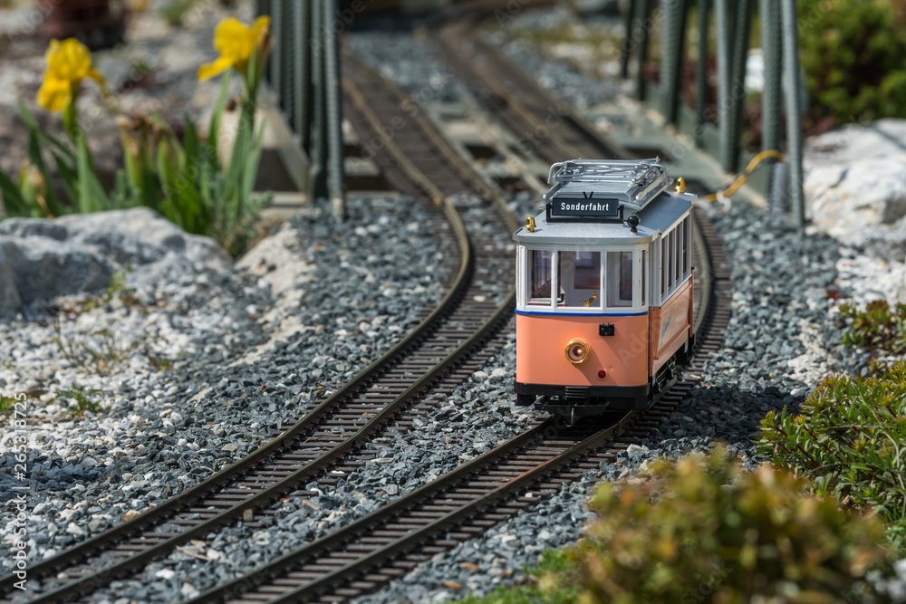 Railway modelling train outdoors on a sunny day