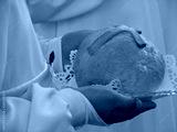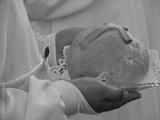 Chleb ze znakiem krzyża w rękach dziecka w białej szacie podczas uroczystości Pierwszej Komunii Swiętej