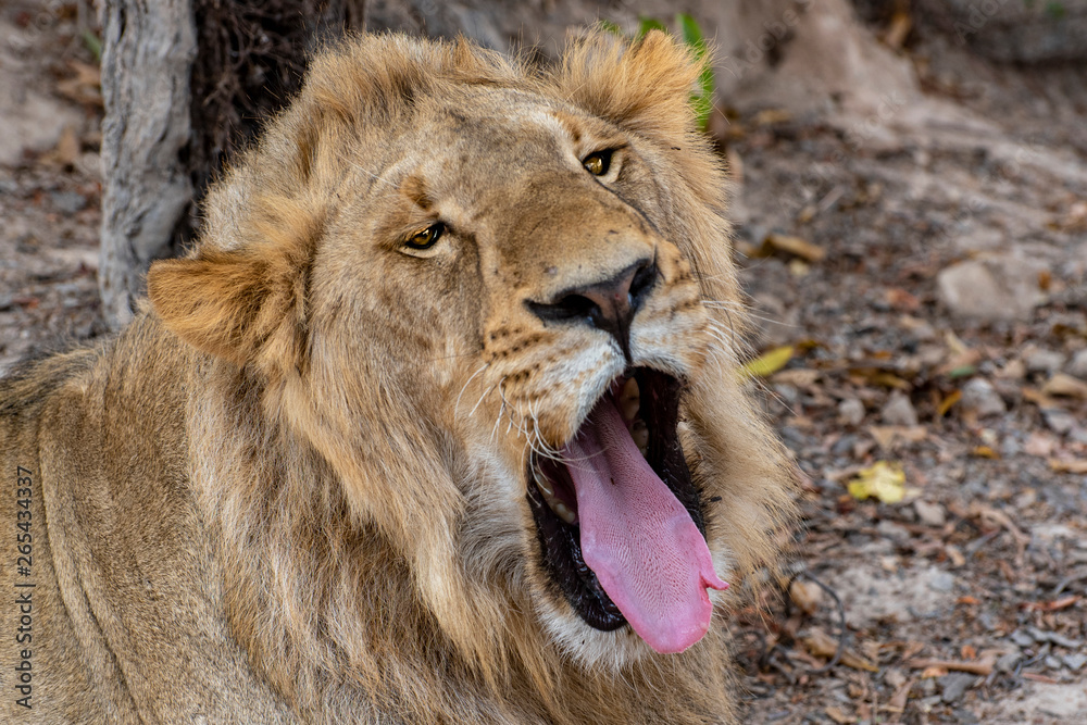 Closeup photograph of a young male lion snarling and looking intimidating.