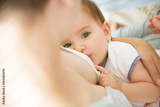Mother breastfeeding baby in her arms at home. Mom breast feeding her newborn child. Baby eating mother's milk. Concept of lactation infant