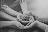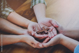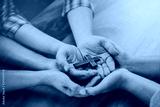 Three people hands holding small wooden cross on wood table, Christian concept Jesus is the center of life or ministry , copy space.