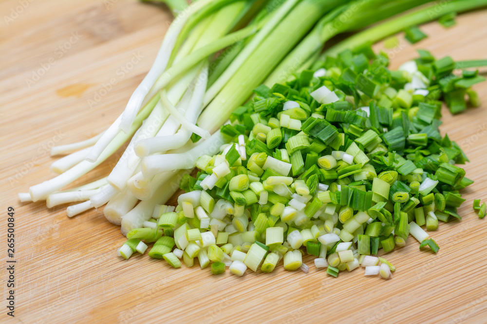 Chopped green garlic on cutting board preparated for cooking.