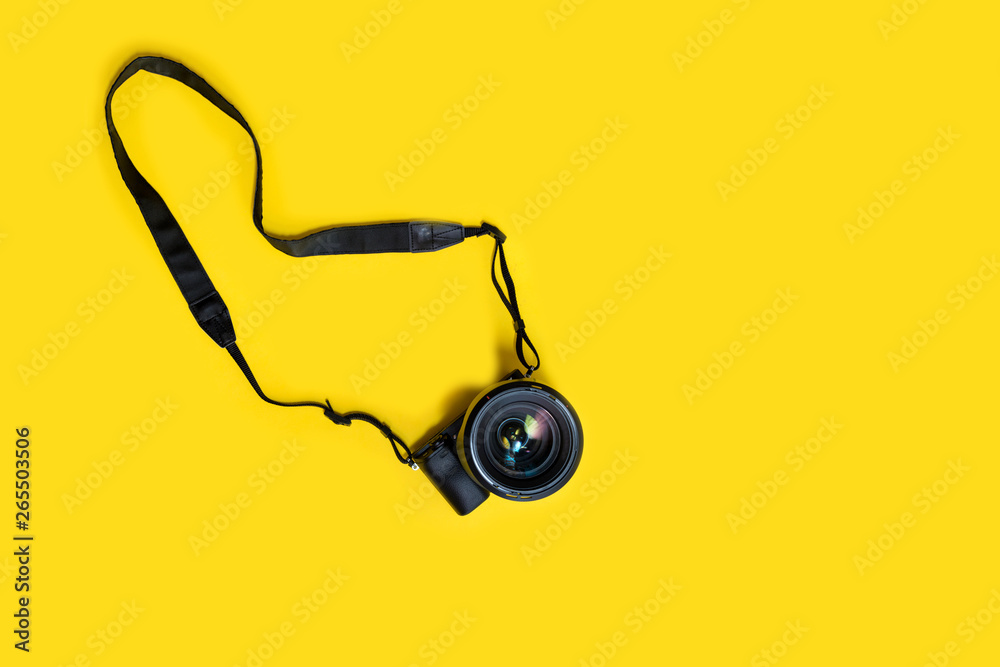 Mirrorless black camera on yellow background, summer memmories photograher blog