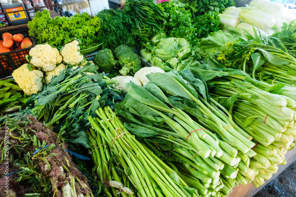 Traditional asian market. Fruits and vegetables at a farmers market. Organic fresh agricultural product.