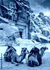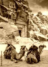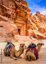 Sandstone temple and camels in Little Petra, ancient city of Petra, Jordan