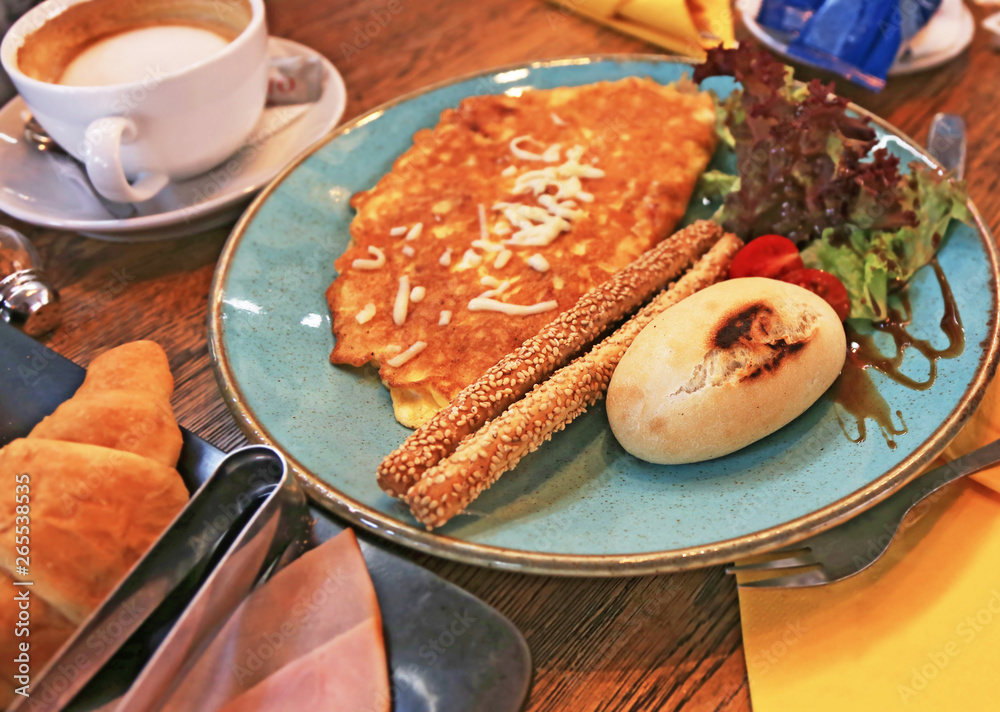 breakfast - brunch with omelette, salad and fresh bread - still life food photography