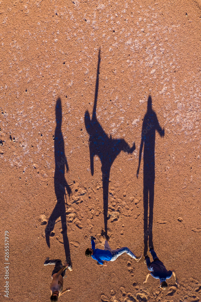 Aerial view real people playing with its shadows during sunrise at Atacama Desert campsite. Amazing textured long shadows on a dry scenery a funny time with their hands up claiming adventure success