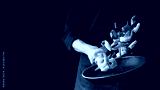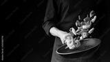 Seafood, Professional cook prepares shrimps with vegetables. Frost in the air, Cooking seafood, healthy vegetarian food and food on a dark background. Horizontal view. Eastern kitchen, banner