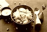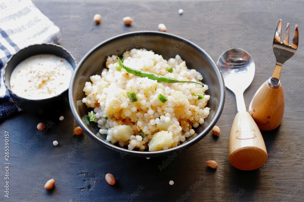 Indian dish made out of Sago called Sabudana khichdi, Usually eaten during fasting days, served with curd in a bowl