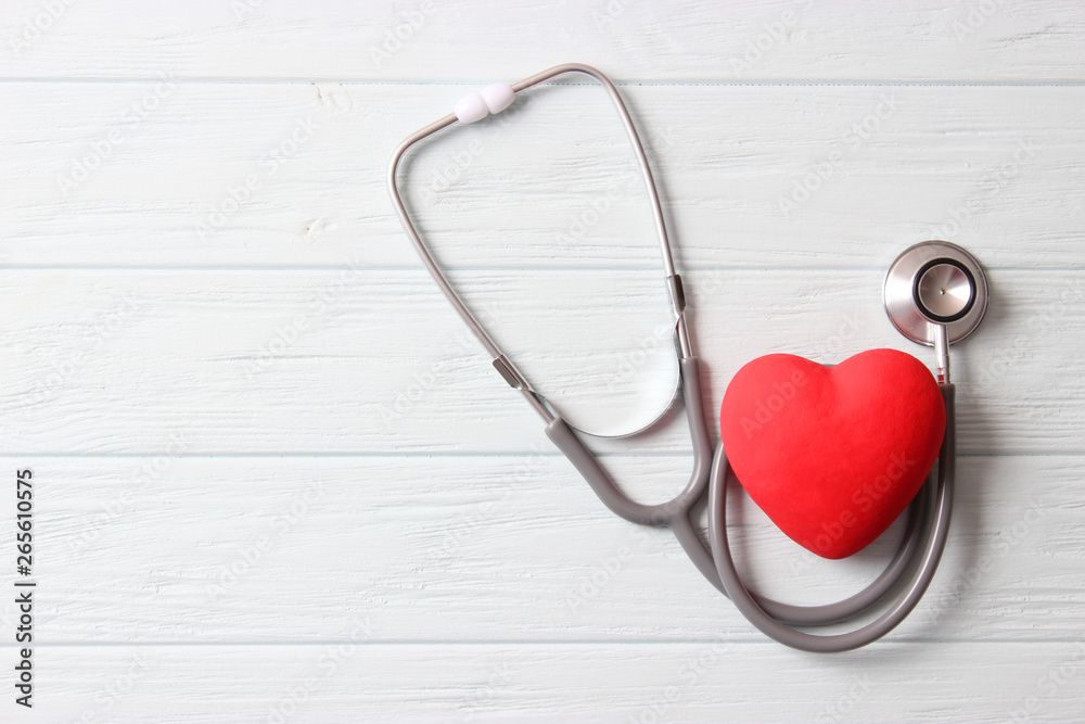 Stethoscope and heart on wooden color background. Health, medicine