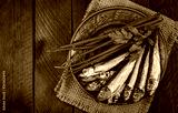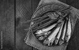 Smoked sprat and green onion on a cutting board on a wooden background. Smoked fish. Top view