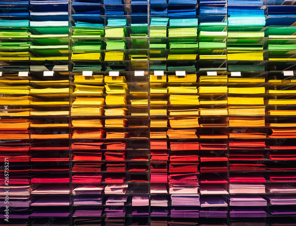 Colourful paper on shelf Stationary shop letter paper and envelope