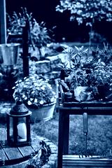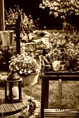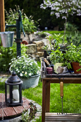 Spring garden scene with lantern and potted herbs