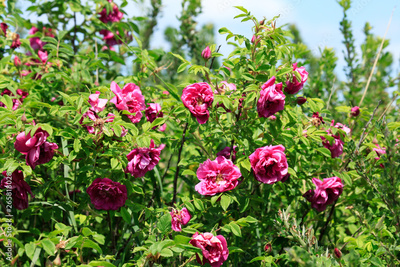 Wild growing bush of tea-rose or fragrant rose (Ros odorata). Beautiful flower with the sweet, fragrant odor