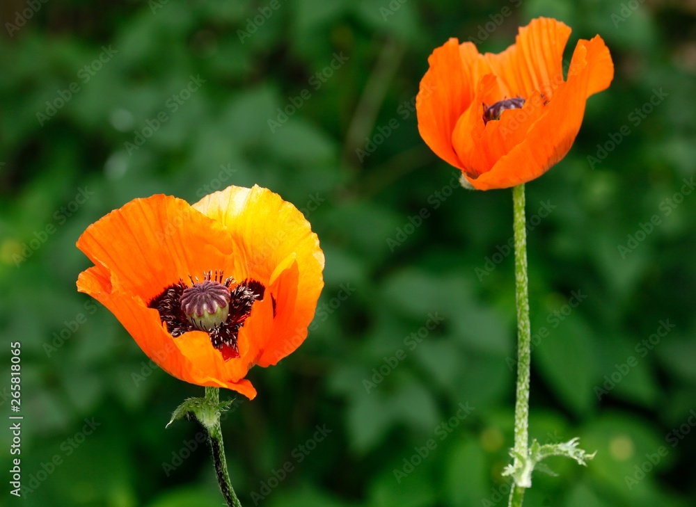 Flowering orange colored poppies in the suburban garden. The close-up of buds of Orientale or Turkish poppies