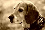 A Beagle dog – hare and rabbits hunter. Dog beagle with collar on the green background is looking into the distance