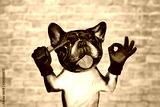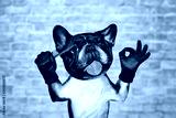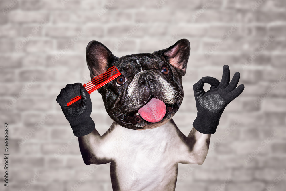 funny dog french bulldog barber groomer hold hairbrush. Man on white brick wall background
