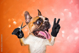 funny dog barber groomer ginger french bulldog hold scissors. Man on orange background