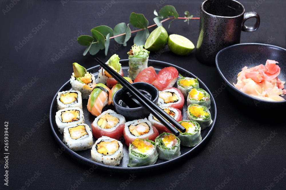 Sushi. Fresh, appetizing set of sushi. Traditional Japanese cuisine