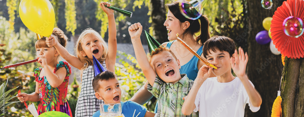 Panoramic view of kids playing with animator during birthday party