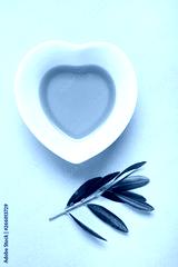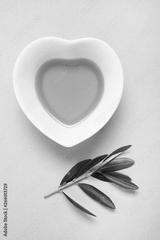 on the uniform green background, a heart-shaped bowl, isolated, with extra virgin olive oil and an olive branch.