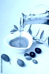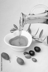 from the oil cruet, the extra virgin olive oil flows into the heart-shaped white ceramic bowl on a uniform green background