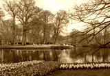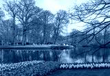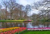 Outdoor sunny landscape view of people enjoy beautiful and colourful blooming tulips and flowers garden and natural park on lakeside, in Spring season at Keukenhof Gardens in Lisse, Netherlands.