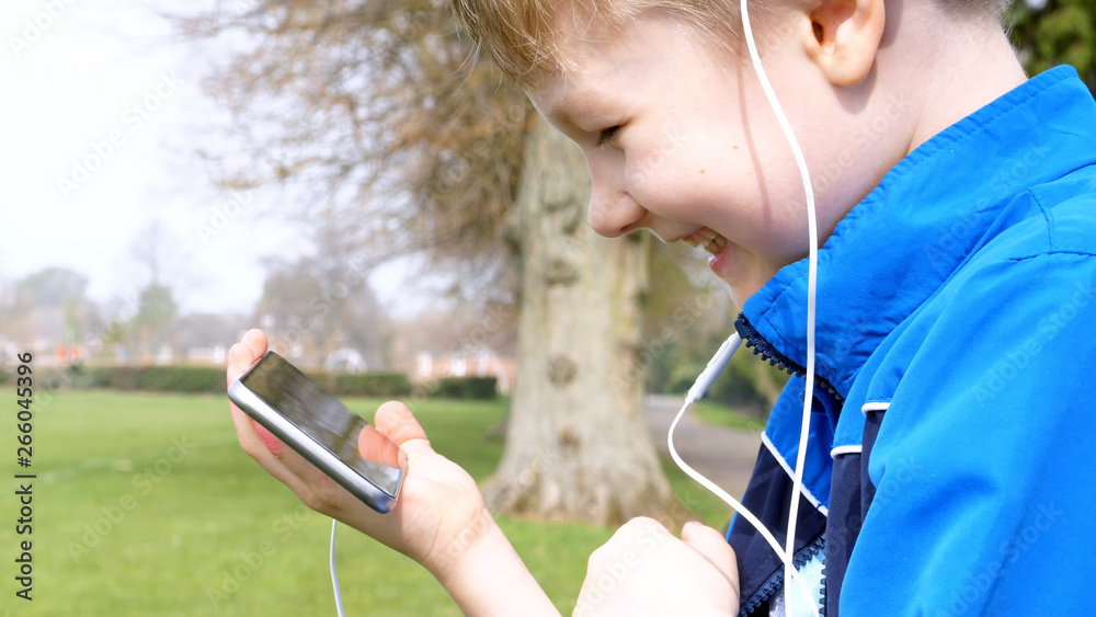 smiling teen boy with smart phone listening or talking while sitting in british park. teenager and social media concept