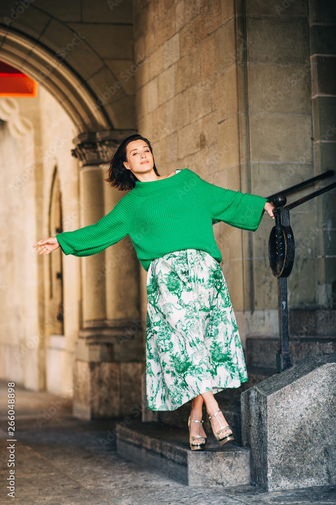 Outdoor fashion portrait of beautiful woman with dark hair, wearing long vintage styled green skirt and pullover, posing on the city street